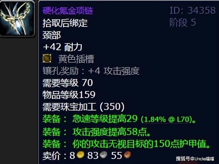 由珠宝加工专业制造的硬化氪金项链,是TBC版本中物理系职业的破甲与急速兼顾的顶级项链。它不仅提供高额的破甲属性,还附带高额的急速等级加成,在对抗高护甲目标时,能同时通过破甲降低敌方防御,通过急速提升攻击频率,实现输出效率的最大化。那么喵叔问问各位大兄弟,你觉得哪个职业入坑硬化氪金项链收益最恐怖如斯呢?