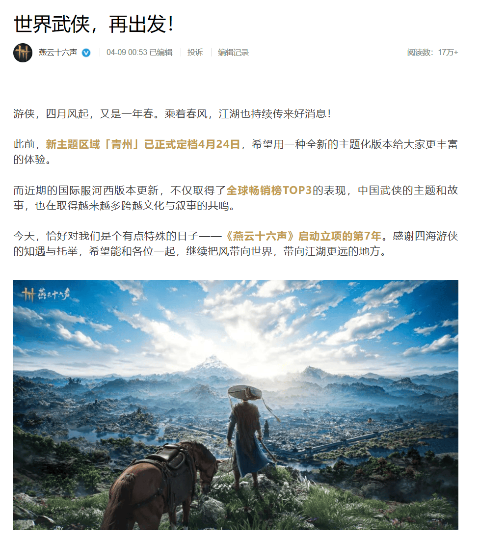 4月9日,官方发布了一篇文章,标题为“世界武侠,再出发”。大致内容除了介绍4月24日即将上线的新区域“青州”,以及透露了一些今年的后续规划,比如除了江南外,还将会加入一块和青州类似“主题区域”,三个新流派和伙伴系统也会陆续上线,但更重要的一点,是在文章最后官方对《燕云》的品牌进行了升级。