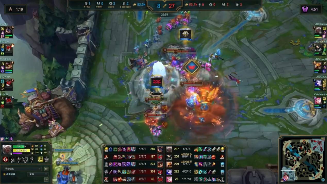 JDG起节奏之后,开始疯狂针对上路的Bin,Bin的兰博多次阵亡发育不良,而BLG的双C又是炸弹人+女枪的组合,劣势局输出不足,抓机会能力差,On的泰坦看起来根本就不想赢,直接出了血鸣,等级落后太多俨然沦为超级兵的存在。