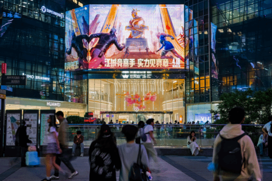比如人流量颇大光谷步行街就立了个巨型观赛屏,不管是不是CF的玩家,都能驻足观看一番,领略一下电竞比赛那针锋相对的魅力。