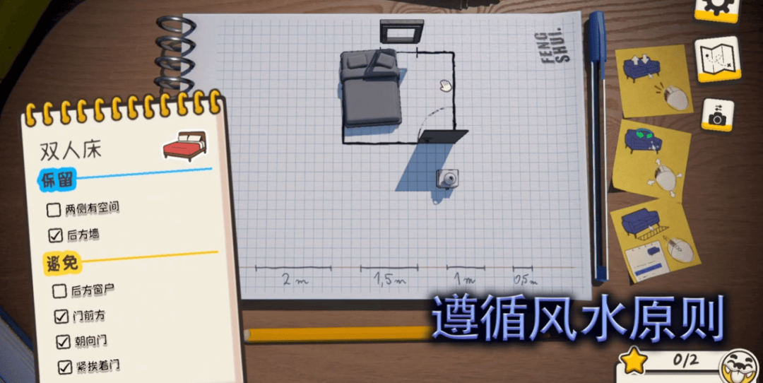 重点在于,游戏里每件家具的摆放,都需要尽可能的满足一系列和风水学有关的延伸条件。就比如一张双人床的位置,不仅需要满足“两侧留有空间”“背靠后方墙”,还需要尽量避免直接朝向门或者靠近后方窗户。