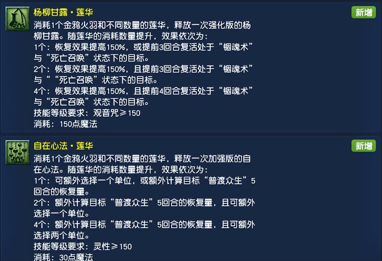 消耗莲华可以提升杨柳甘露、自在心法的技能效果,消耗时需要使用道具金鸦火羽。其中,杨柳甘露·莲华可通过消耗4个莲华,提前4回合拉起被小死亡的单位,在高端PK局中十分实用;自在心法·莲华可通过消耗4个莲华,可额外计算“普度众生”的恢复量,并额外选择两个单位,恢复能力非常强劲。