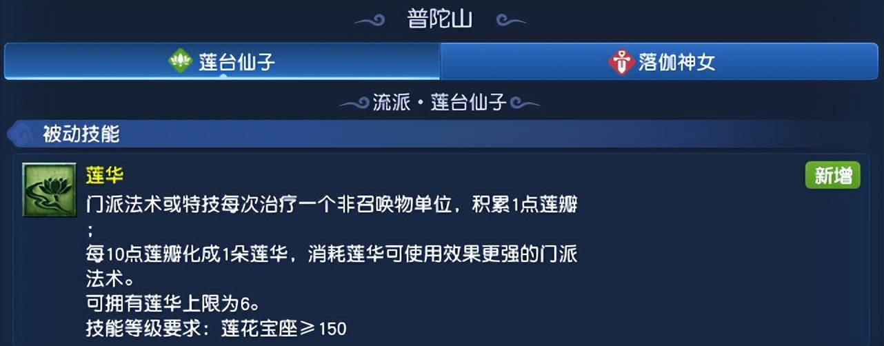 【莲台仙子】流派的新增的被动技能为“莲华”。每次治疗非召唤物单位,可积累1点莲瓣,集满10点将化成1朵莲华。
