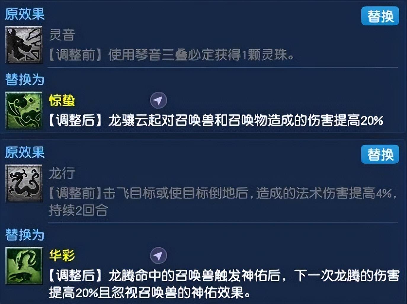 曾经与大唐并称“一时瑜亮”的龙宫,最近也强势崛起。这次调整后,龙宫的“灵音”和“龙行”均被替换,新上任的“惊蛰”和“华彩”两个技能,可都被视为针对召唤兽的调整,都更利于清宠战术的执行。
