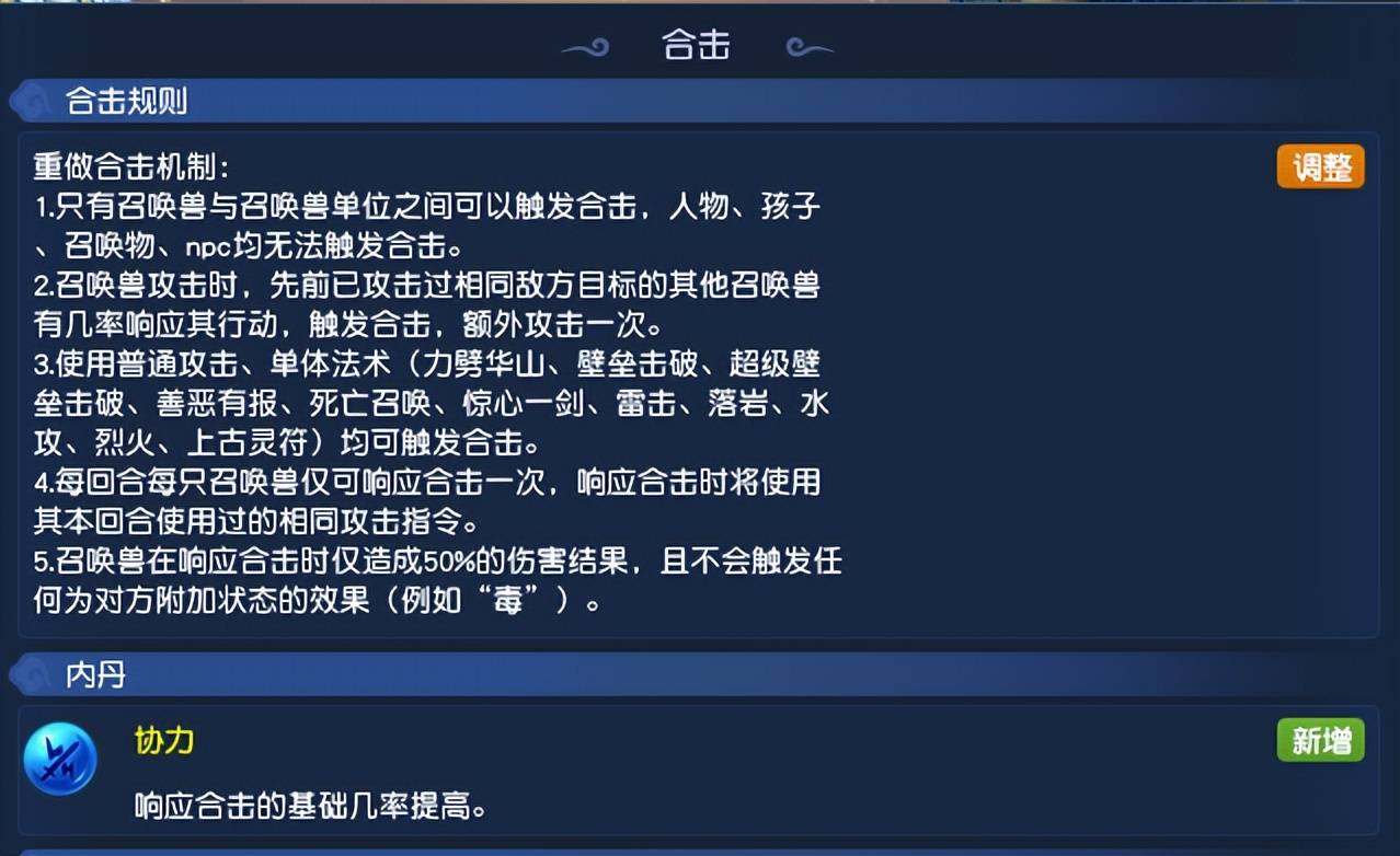 本次通用调整方面,重点调整了“合击”技能的效果。调整之后,只有召唤兽和召唤兽才能触发合击,但合击不在的一段伤害,而是改成了一只召唤兽攻击完,另外一只召唤兽会额外攻击一次。这就意味着,合计的伤害比之前高了。而且,本次调整之后,还增加了可以增加合击几率的【协力】内丹,非常值得大家关注。