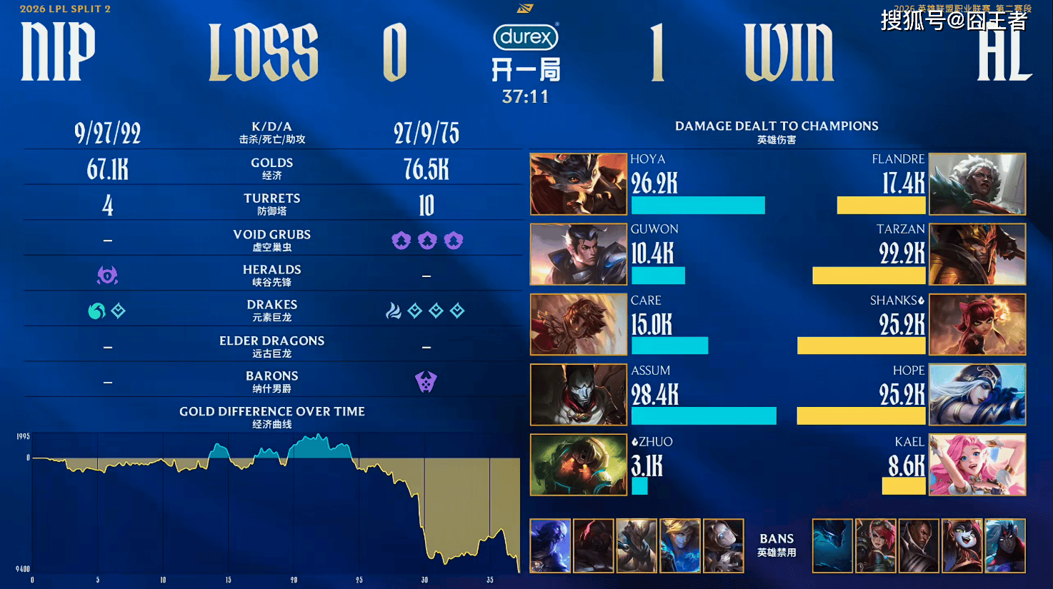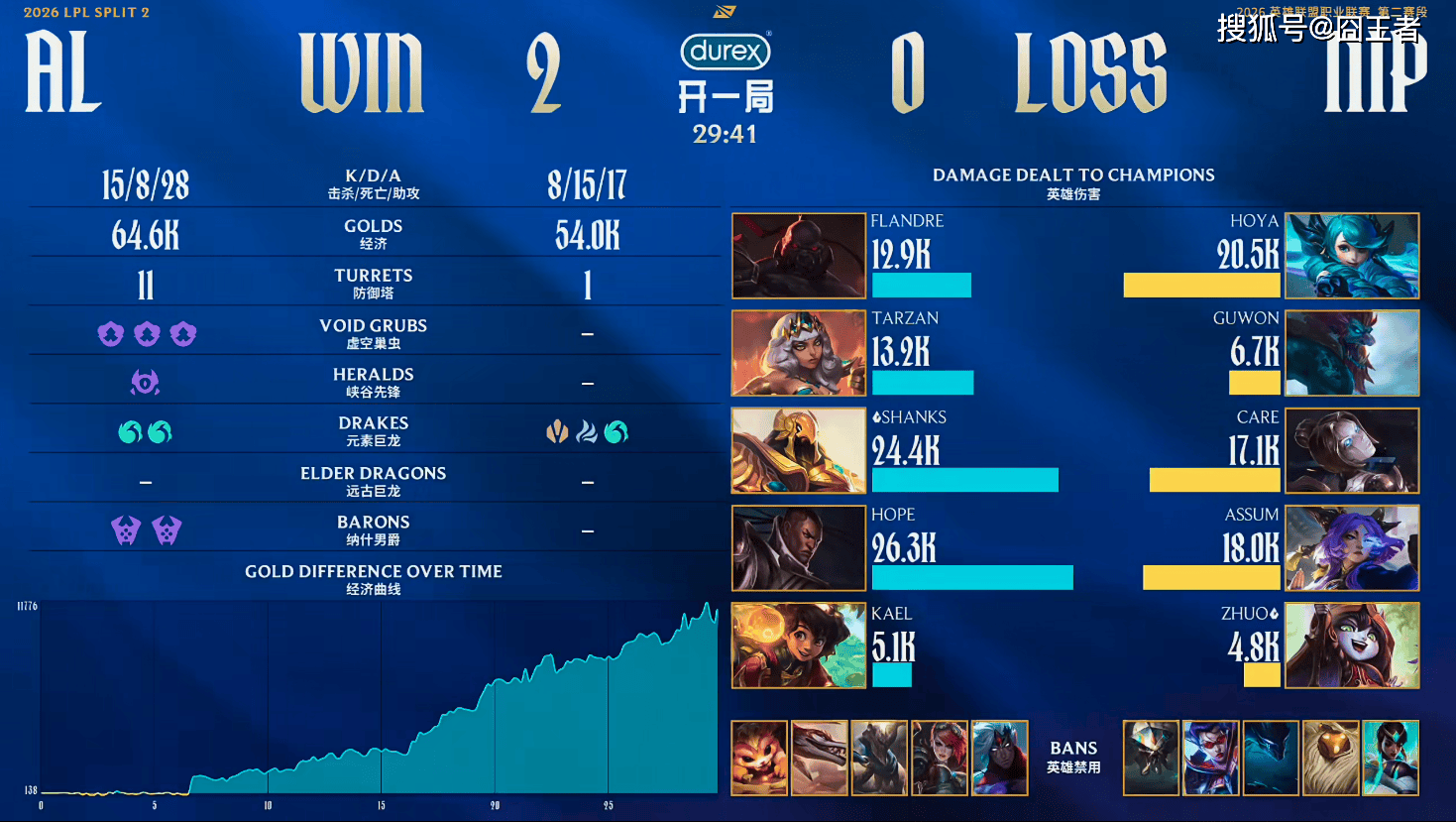 结果第一局比赛,两队在中前打得十分焦灼,经济交替领先,但是进入后期,就是AL的天下了。2分钟:Guwon赵信反野被安妮反包,Tarzan皇子拿下一血;5分钟:Hope寒冰闪现失误接钩被烬拿下人头;11分钟:Hope交出死亡闪再被线杀,Tarzan皇子兜底换掉两人;13分钟:Tarzan稳稳惩下小龙,但NIP后续追击留下AL两人;19分钟:NIP围剿Shanks,狼母TP来救反而送上双杀;24分钟:AL果断开团留人,连续击杀NIP三人;27分钟:NIP抓下路被安妮逃脱,AL随后果断反开rush大龙;29分钟:AL团队配合分割阵型,团战摧枯拉朽打出0换5;最终37分11秒:AL龙魂团打出团灭,随后一波结束比赛