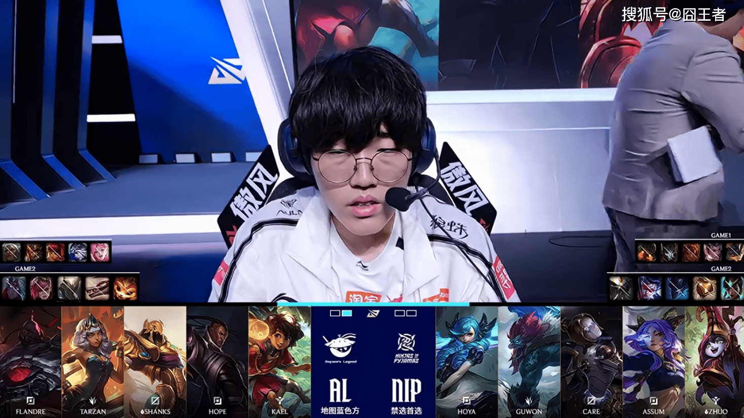 第二局比赛,AL蓝色方,禁用:韦鲁斯、蔚、潘森、纳亚菲利、纳尔,选用:Flandre赛恩、Tarzan奇亚娜、Shanks沙皇、Hope卢锡安、Kael米利欧;NIP红色方,禁用:卡尔玛、巴德、梦魇、薇恩、蝎子,选用:HOYA格温、Guwon巨魔、Care发条、Assum芸阿娜、Zhuo璐璐