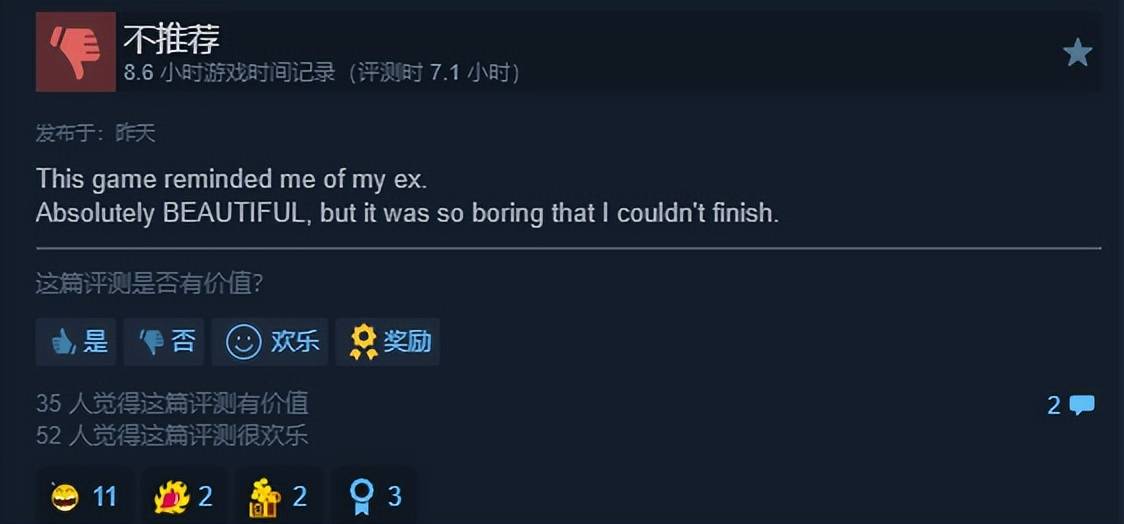 但对玩家群体而言,游戏的整体体验可谓是泾渭分明。大部分玩家先是肯定了制作组在视觉上所下的功夫,都一致给到夯,而对于其他部分,给到的则是拉完了。无论是战斗部分的手感问题,还是部分演出对话无法跳过的问题,都容易让一部分玩家在中后段开始疲惫。有玩家甚至说这款游戏让他想起前任,好看的模样但是无聊。