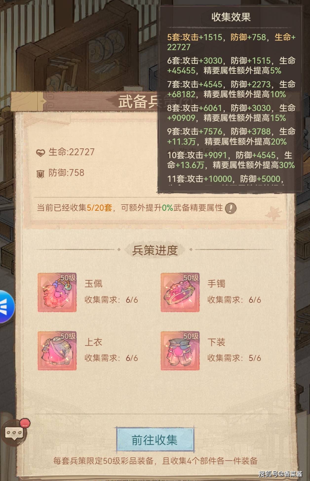 他山石、高级强化石获取难度较高,能凑齐5套优质词条彩装已属不易。不建议强行追求20套50级彩装,资源有限,能激活多少算多少,稳步提升即可,重点把武备精要的加成等级拉起来。